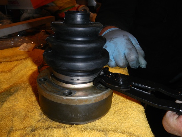 Boot installed and clamping the Oetiker clamp. Make sure the "nubbie" of the clamp doesn't interfere with a bolt hole!