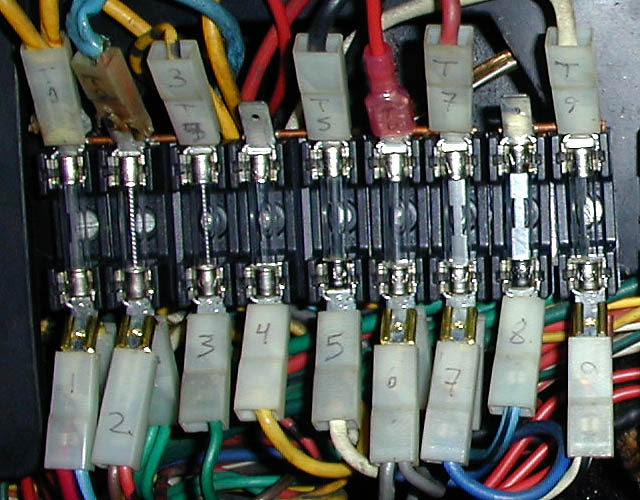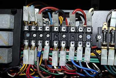 Note T2 is melted from the original fuseblocks overheating. Also note the use of the splitters on the bottom row for the circuits that have two wires (1,2,6 and 7 on this example). Note that T4 and T8 have no wires connected. They get power through the bus bar on the back of the fuseblocks. |