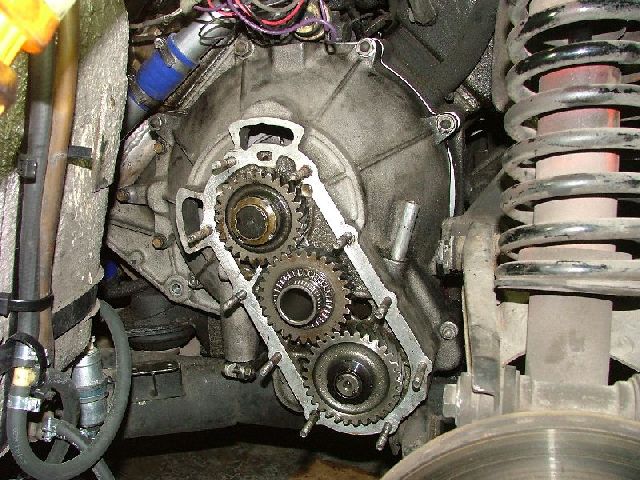 To have clear access to the bellhousing, you will need to remove the plastic duct going to the oil cooler. This is held on by a single bolt at the top of the metal bracket riveted to the duct. On carb cars, you will also need to remove the fuel filter from the mounting bracket. There is no need to remove the fuel lines, but you do need to get the filter housing out of the way to remove the bellhousing. This photo shows the clutch linkage pivot arm and the two pivot pins that need to be removed. The lower one connects the arm to the clutch cable and the middle one (shown disconnected) is connected to a short turnbuckle. This, in turn, is connected to an arm on the bottom of the bellhousing. Each pin is secured with a cotter pin. It's easier at this point to disconnect as much as possible. After removing the two pivot pins, remove the linkage arm by removing the large pivot bolt holding the arm to the bellhousing. Drain the oil from the gearbox and the transfer case. Rather than copying the procedure into this document, you can read how to do it from this article on Birdman's website. Remove the ten nuts holding the transfer case cover. The transfer case cover will be sealed to the bellhousing, and it will require a bit of force (not a lot, but a bit) to remove. I used a large screwdriver as a lever between the bellhousing and the filler plug to break the seal. Once loose, it easily slid off the mounting studs. Once the cover is removed, the drop gears are exposed. You will be removing the lower and middle gear. The top gear does not need to be removed. As you can see in the photo, the sides of the ring nut are peened inward to lock the nut in place. You will need to use a small punch to bend the sides of the ring nut back out so you can loosen it. Here's how I set things up to remove the ring nut. The nut is torqued pretty tight so I needed a way to get enough leverage to loosen it. I used my long breaker bar, a long extension, the special Baum ring nut socket (#FR-102 from the Baum Tools Ferrari catalog) and a piece of wood with a notch in it to support the free end of the extension. To keep the engine from turning, I stuffed a shop towel between the gears and the ring nut easily loosened up. When the ring nut is loose, you can remove the shop towel and remove the center gear. Be careful as there are thrust bearings on both sides of the gear. The gear should slide out very easily. Make note of which side is facing out. My gear was engraved with the transmission number on the inner surface. The lower gear should just slide off the shaft. Mine was not stuck and I was able to get it off without a gear puller. Just like the middle gear, the inner surface of the lower gear was engraved with the transmission number. Behind the lower gear is a bearing which is held in by an internal snap ring. Use a pair of snap ring pliers to remove the snap ring. The bearing may or may not slide out easily. If it doesn't come out right away, don't worry about it just yet. When the bellhousing is loosened and pulled away from the engine, the bearing will slide out. There are two sizes of nuts and bolts holding the bellhousing onto the back of the engine. Remove all the hardware, including the crankcase breather tube and the gearbox breather tube. Once the bellhousing is loose, you will need to break the seal between it and the engine. I made a puller from a piece of scrap steel. Two of the transfer case cover studs are in line with the transmission input shaft. I drilled two holes in the scrap piece to fit the two studs and was able to just get the nuts back on with the puller in place. By slowly tightening the nuts, the bellhousing broke the seal and pulled away. After the bellhousing moved away from the engine about 1", I remove the puller and did the rest by hand. By gently moving the bellhousing in and out, the lower bearing walked out on the input shaft and I was able to remove it. Once the bearing is removed, pull out the stepped spacer to expose the inner external snap ring. Use a pair of expanding snap ring pliers to remove this ring. This is very important as you will not be able to remove the bellhousing without removing this inner ring. Grab the bellhousing with both hands and carefully slide it straight out off the mounting studs and the transmission shaft. You will need to do a little maneuvering to get the bellhousing past the suspension components. It is heavy and the space is tight so be careful! With the bellhousing out of the way, you have clear access to the pressure plate. The pressure plate is held onto the flywheel with six fairly small bolts. I used an air impact hammer to remove the bolts and the engine did not rotate. If needed, you can put a ratchet with the 36mm socket on the crankshaft nose and jamb it against the rear suspension a-arm to keep the engine from turning. In addition to the six bolts, the pressure plate is held on to three locator pins on the flywheel. A little prying with a screwdriver will separate the pressure plate from the flywheel. The friction disc will come out along with the pressure plate. As you can see from this picture of a new friction disc compare to my old one, my clutch was definitely worn out. My flywheel was in pretty rough shape so I decided to get it resurfaced. To be sure I put the flywheel back on in the same orientation, I turned the engine to the 1-2 timing mark before loosening the flywheel bolts. This was actually not necessary since the holes are drilled slightly offset so the flywheel only goes on in one orientation. These bolts are really tight and I needed to use the breaker bar, long extension and block of wood trick again. There is nothing too special about the flywheel and any competent machine shop can resurface it. I took mine to a local shop and $60 later, it looked great. There's nothing quite like a freshly machined surface. Make sure you get the locating pins back from the machine shop! My pilot bearing seemed in pretty good shape