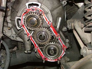 Making sure the gears are facing the correct way, slide the lower gear onto the transmission input shaft and the middle gear in the transfer case. My gears were engraved the transmission number on the inner surfaces so I knew which side faced out. Put the new lower ring nut on and torque to 145 lbs-ft. I used the long extension and block of wood trick again, but this time with a torque wrench. The crankshaft still had the ratchet attached to keep the engine from turning so I did not need to stuff a rag in the gears again. Once torqued, the lower ring nut needs to be peened on the sides to lock it in place. I did this using a hammer and flat chisel, peening to the grooves on the sides of the transmission input shaft. As with the bellhousing, clean off any old sealant on the mating surfaces of the transfer case cover. Run a bead of Loctite 518 on the bellhousing side of the transfer case and install the cover. Torque all the nuts to 18 lbs-ft.