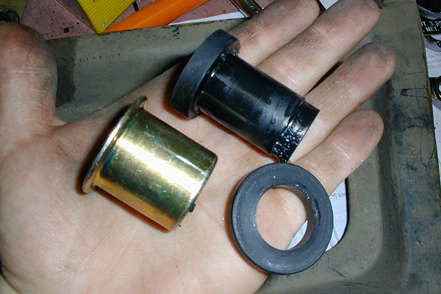 The stock bushings are made from a spool-shaped inner metal bushing, surrounded by a rubber cylinder, surrounded by an outer metal cylinder, which is tack-welded into the suspension arm (often called the "A arm"). The rubber is bonded between the two metal parts.