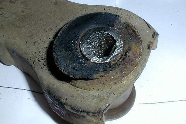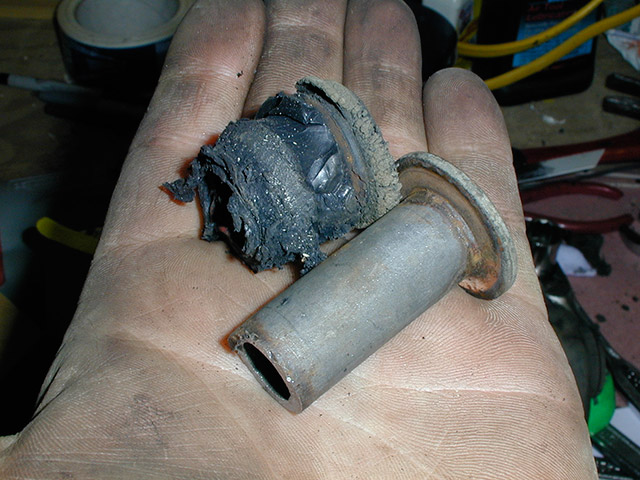 Voila!The rubber and inner bushing (with one end of the spindle cut off) removed from the outer bushing.