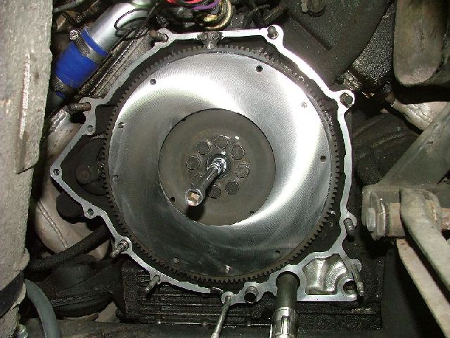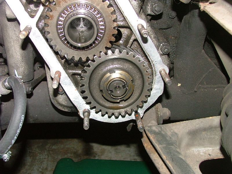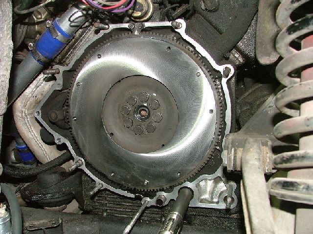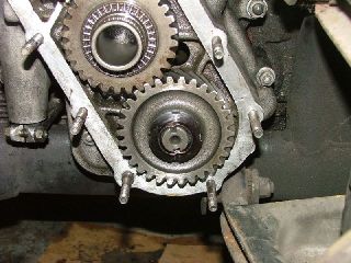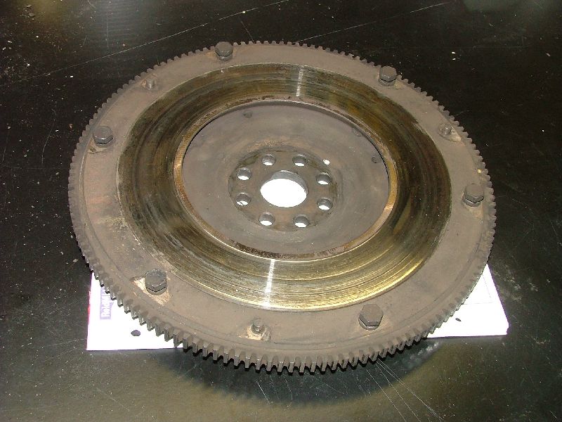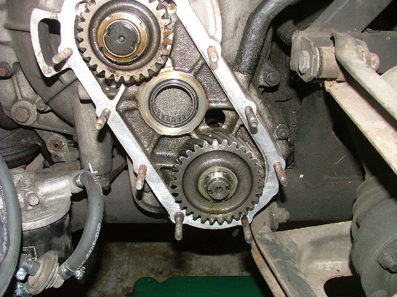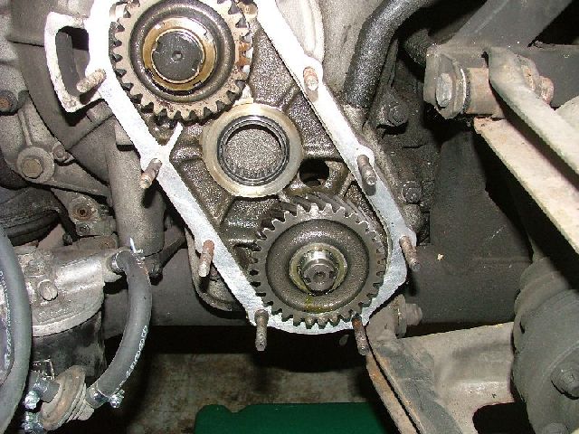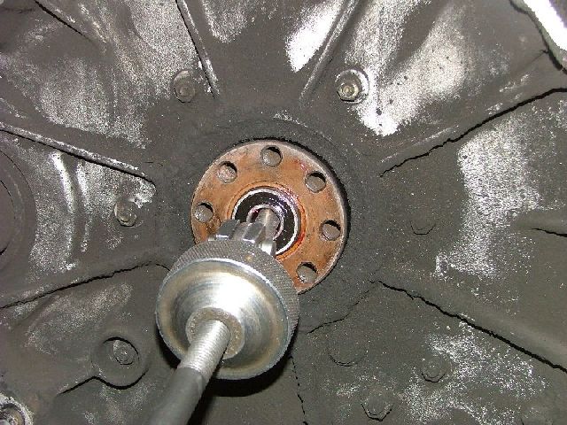 To have clear access to the bellhousing, you will need to remove the plastic duct going to the oil cooler. This is held on by a single bolt at the top of the metal bracket riveted to the duct. On carb cars, you will also need to remove the fuel filter from the mounting bracket. There is no need to remove the fuel lines, but you do need to get the filter housing out of the way to remove the bellhousing. This photo shows the clutch linkage pivot arm and the two pivot pins that need to be removed. The lower one connects the arm to the clutch cable and the middle one (shown disconnected) is connected to a short turnbuckle. This, in turn, is connected to an arm on the bottom of the bellhousing. Each pin is secured with a cotter pin. It's easier at this point to disconnect as much as possible. After removing the two pivot pins, remove the linkage arm by removing the large pivot bolt holding the arm to the bellhousing. Drain the oil from the gearbox and the transfer case. Rather than copying the procedure into this document, you can read how to do it from this article on Birdman's website. Remove the ten nuts holding the transfer case cover. The transfer case cover will be sealed to the bellhousing, and it will require a bit of force (not a lot, but a bit) to remove. I used a large screwdriver as a lever between the bellhousing and the filler plug to break the seal. Once loose, it easily slid off the mounting studs. Once the cover is removed, the drop gears are exposed. You will be removing the lower and middle gear. The top gear does not need to be removed. As you can see in the photo, the sides of the ring nut are peened inward to lock the nut in place. You will need to use a small punch to bend the sides of the ring nut back out so you can loosen it. Here's how I set things up to remove the ring nut. The nut is torqued pretty tight so I needed a way to get enough leverage to loosen it. I used my long breaker bar, a long extension, the special Baum ring nut socket (#FR-102 from the Baum Tools Ferrari catalog) and a piece of wood with a notch in it to support the free end of the extension. To keep the engine from turning, I stuffed a shop towel between the gears and the ring nut easily loosened up. When the ring nut is loose, you can remove the shop towel and remove the center gear. Be careful as there are thrust bearings on both sides of the gear. The gear should slide out very easily. Make note of which side is facing out. My gear was engraved with the transmission number on the inner surface. The lower gear should just slide off the shaft. Mine was not stuck and I was able to get it off without a gear puller. Just like the middle gear, the inner surface of the lower gear was engraved with the transmission number. Behind the lower gear is a bearing which is held in by an internal snap ring. Use a pair of snap ring pliers to remove the snap ring. The bearing may or may not slide out easily. If it doesn't come out right away, don't worry about it just yet. When the bellhousing is loosened and pulled away from the engine, the bearing will slide out. There are two sizes of nuts and bolts holding the bellhousing onto the back of the engine. Remove all the hardware, including the crankcase breather tube and the gearbox breather tube. Once the bellhousing is loose, you will need to break the seal between it and the engine. I made a puller from a piece of scrap steel. Two of the transfer case cover studs are in line with the transmission input shaft. I drilled two holes in the scrap piece to fit the two studs and was able to just get the nuts back on with the puller in place. By slowly tightening the nuts, the bellhousing broke the seal and pulled away. After the bellhousing moved away from the engine about 1", I remove the puller and did the rest by hand. By gently moving the bellhousing in and out, the lower bearing walked out on the input shaft and I was able to remove it. Once the bearing is removed, pull out the stepped spacer to expose the inner external snap ring. Use a pair of expanding snap ring pliers to remove this ring. This is very important as you will not be able to remove the bellhousing without removing this inner ring. Grab the bellhousing with both hands and carefully slide it straight out off the mounting studs and the transmission shaft. You will need to do a little maneuvering to get the bellhousing past the suspension components. It is heavy and the space is tight so be careful! With the bellhousing out of the way, you have clear access to the pressure plate. The pressure plate is held onto the flywheel with six fairly small bolts. I used an air impact hammer to remove the bolts and the engine did not rotate. If needed, you can put a ratchet with the 36mm socket on the crankshaft nose and jamb it against the rear suspension a-arm to keep the engine from turning. In addition to the six bolts, the pressure plate is held on to three locator pins on the flywheel. A little prying with a screwdriver will separate the pressure plate from the flywheel. The friction disc will come out along with the pressure plate. As you can see from this picture of a new friction disc compare to my old one, my clutch was definitely worn out. My flywheel was in pretty rough shape so I decided to get it resurfaced. To be sure I put the flywheel back on in the same orientation, I turned the engine to the 1-2 timing mark before loosening the flywheel bolts. This was actually not necessary since the holes are drilled slightly offset so the flywheel only goes on in one orientation. These bolts are really tight and I needed to use the breaker bar, long extension and block of wood trick again. There is nothing too special about the flywheel and any competent machine shop can resurface it. I took mine to a local shop and $60 later, it looked great. There's nothing quite like a freshly machined surface. Make sure you get the locating pins back from the machine shop! My pilot bearing seemed in pretty good shape