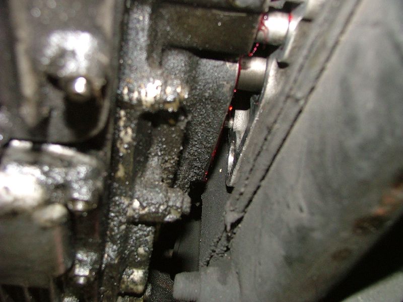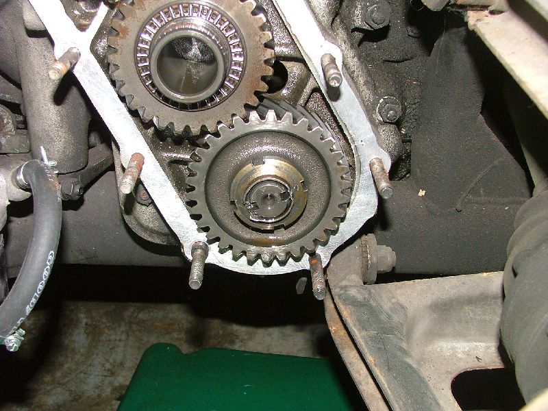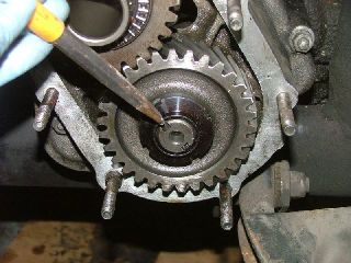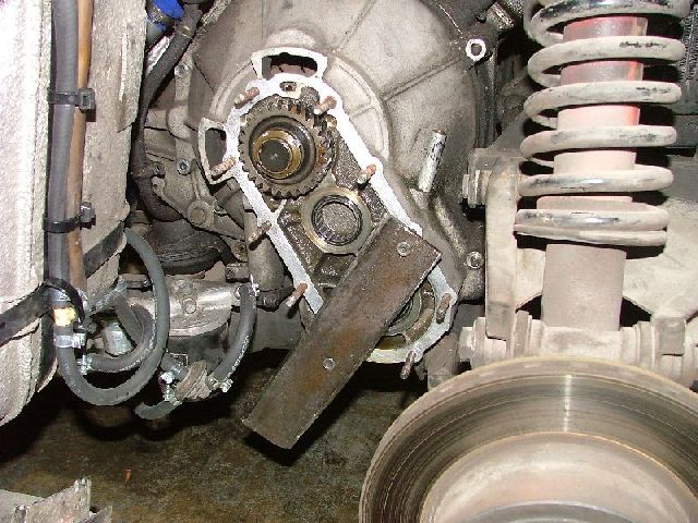 Making sure the gears are facing the correct way, slide the lower gear onto the transmission input shaft and the middle gear in the transfer case. My gears were engraved the transmission number on the inner surfaces so I knew which side faced out. Put the new lower ring nut on and torque to 145 lbs-ft. I used the long extension and block of wood trick again, but this time with a torque wrench. The crankshaft still had the ratchet attached to keep the engine from turning so I did not need to stuff a rag in the gears again. Once torqued, the lower ring nut needs to be peened on the sides to lock it in place. I did this using a hammer and flat chisel, peening to the grooves on the sides of the transmission input shaft. As with the bellhousing, clean off any old sealant on the mating surfaces of the transfer case cover. Run a bead of Loctite 518 on the bellhousing side of the transfer case and install the cover. Torque all the nuts to 18 lbs-ft.