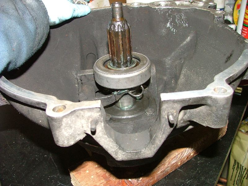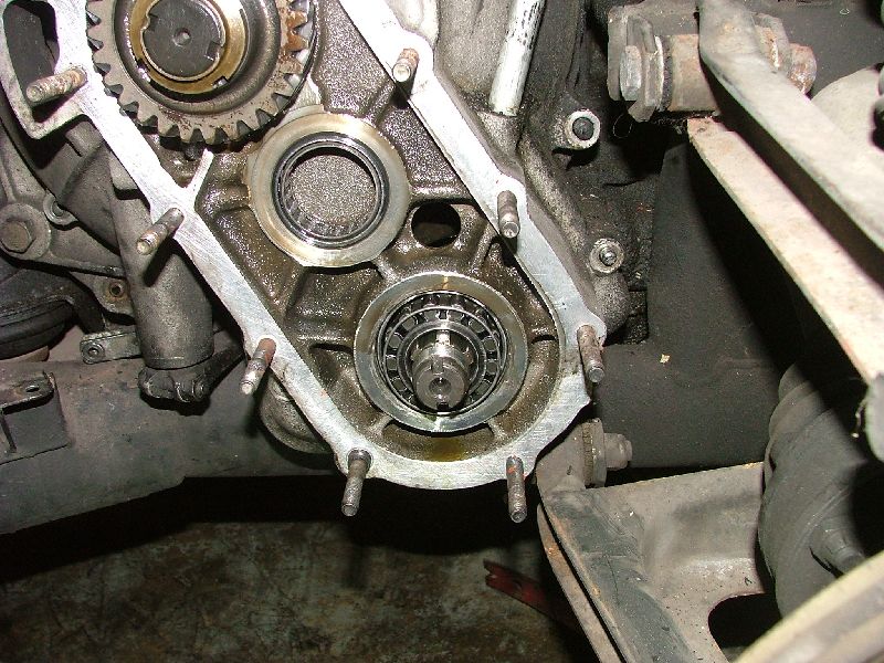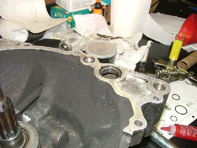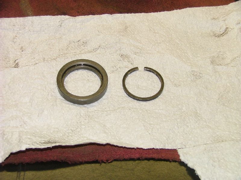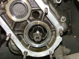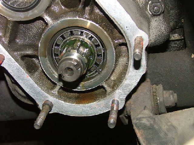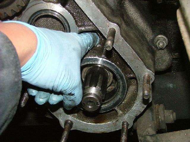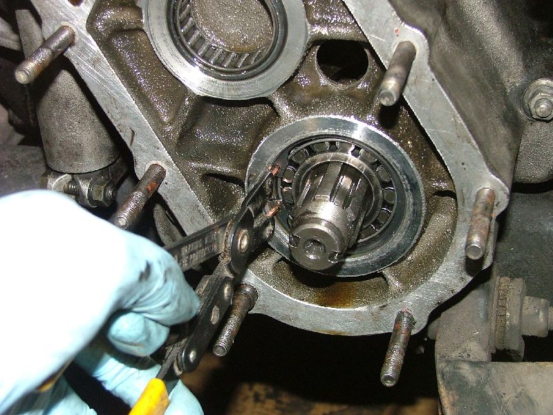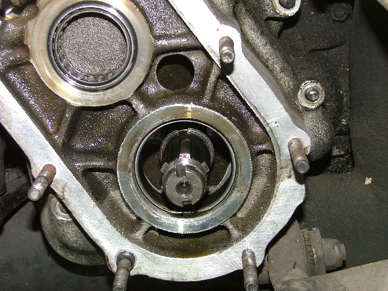 There are three O-rings between the bellhousing and the engine. Two of the grooves are on the bellhousing side and one is on the engine side. Install the O-rings with a small dab of sealant to hold them in place. Run a bead of sealant on the engine side mating surface. You only need to seal the lower right corner as this is the only place where gear oil passes. It's not necessary to seal completely around the bellhousing as it will only make disassembly more difficult next time. I used Loctite 518, an anerobic gasket eliminator. Grab the bellhousing and carefully slide it into place. You need to be careful to not dislodge the O-rings. I put the bellhousing on and maneuvered it by hand until I could feel the output shaft engage in the clutch splines. Once it was on, I put the bellhousing nuts back on and slowly started tightening to pull the bellhousing toward the engine. While there was still some space between the engine and bellhousing, I crawled back under the car to make sure the O-rings were still in place. Remember that one of the bellhousing nuts holds the crankcase breather. If all is well, tighten all the bellhousing nuts and bolts. The large fasteners are torqued to 40 lbs-ft and the small ones are torqued to 18 lbs-ft. Install the inner snap ring first, then the stepped collar, with the step toward the snap ring. When installed correctly, the inner snap ring will sit inside the step of the collar. Using snap ring pliers, put the snap ring onto the transmission shaft and slide it into place in the groove. Make sure it's fully seated, then slide on the stepped collar. I was able to get the collar to seat correctly by lightly tapping on it with a small ball peen hammer and a brass drift. After tapping all around the collar, I could feel it seat correctly onto the snap ring. A simple way to check is to stick your finger into the hole above the shaft. You should be able to feel the snap ring seated into the back of the collar. When the collar is in place, slide the lower bearing back on. You may need to tap lightly on the inner race to get it go in completely. You know it's in far enough when the outer snap ring groove is exposed. Using a pair of snap ring pliers, install the outer snap ring.